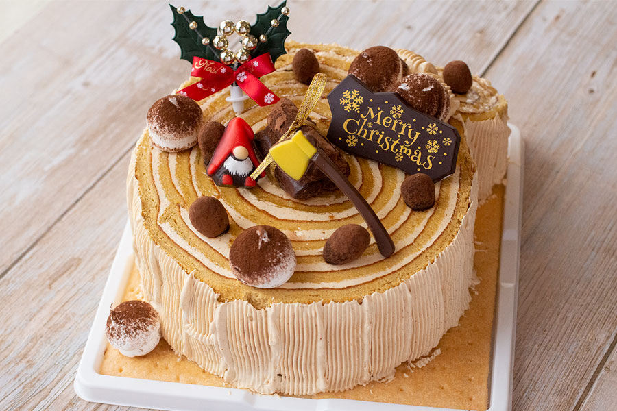 クリスマスにしか味わえない、オリジナルケーキ。キャラメル風味のスポンジに、洋酒を効かせたアーモンドクリームを伸ばし、クルクルと巻いて切り株状にしました。チョコクリームの薪とメレンゲのキノコが、アクセントになっています。洋酒が効いた、大人向けのケーキです。